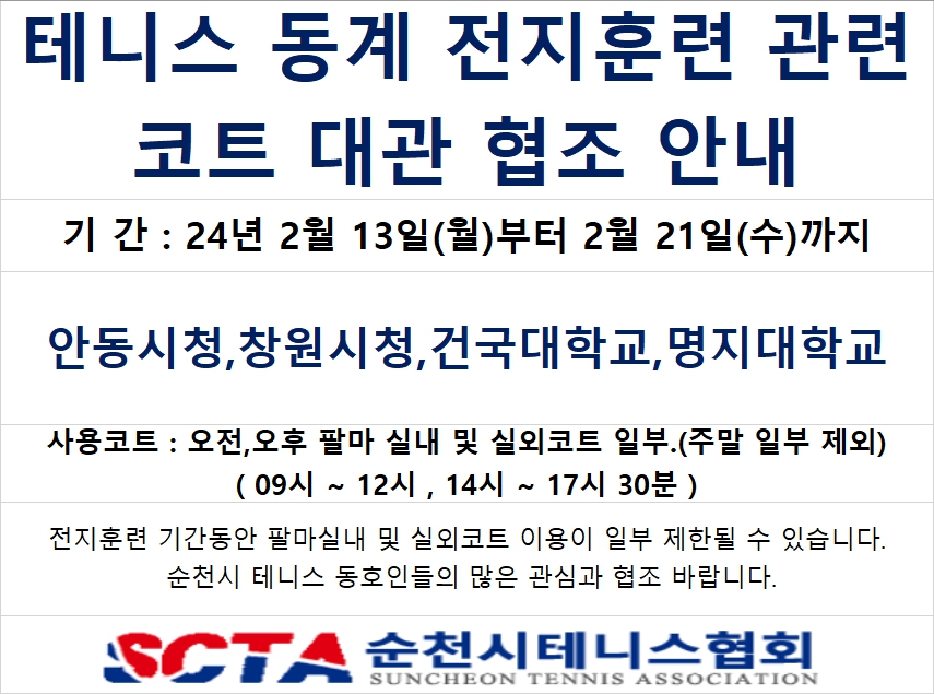 2¿ù 3,4ÁÖÂ÷ ÀüÁöÈÆ·Ã ÄÚÆ® ´ë°ü ÇùÁ¶ ¾È³»2¿ù 23ÀϺÎÅÍ ÁøÇàµÇ´Â 2024 ¿©¼ö ¿Àµ¿µµ¹è ¿ÀÇ Å״Ͻº´ëȸ °ü·ÃÇÏ¿©ÀüÁöÈÆ·ÃÆÀ ÄÚÆ® ´ë°ü ÇùÁ¶¿¡ ¼øÃµ½Ã Å״Ͻº µ¿È£ÀκеéÀÇ ¸¹Àº ¾çÇØ¿ÍÇùÁ¶ ºÎŹ µå¸³´Ï´Ù.